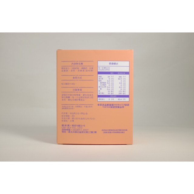 - 成分:膠原蛋白、全脂奶粉、磷酸鈣、抗壞血酸鈉、香料、蔗糖素(甜味劑)